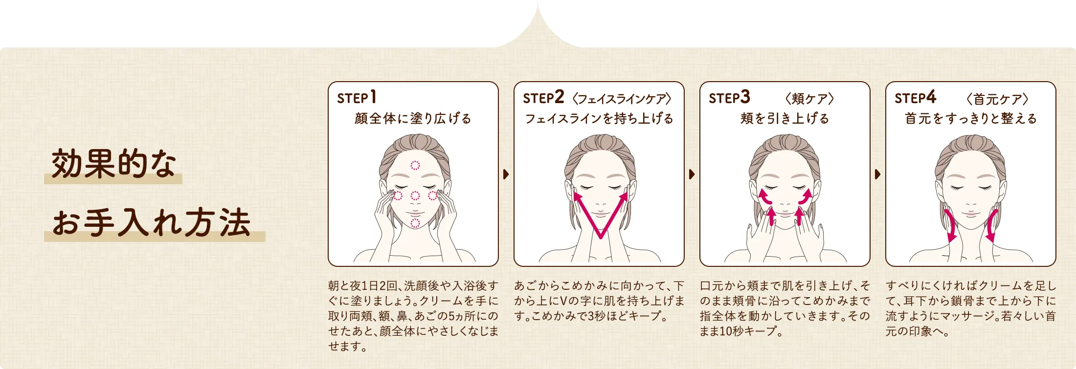 - ●乾燥が気になる部分にはやさしく重ね塗りをして、卵にそっと触れるように両手でやさしくお肌を包み込み、美容成分を丁寧に届けましょう。