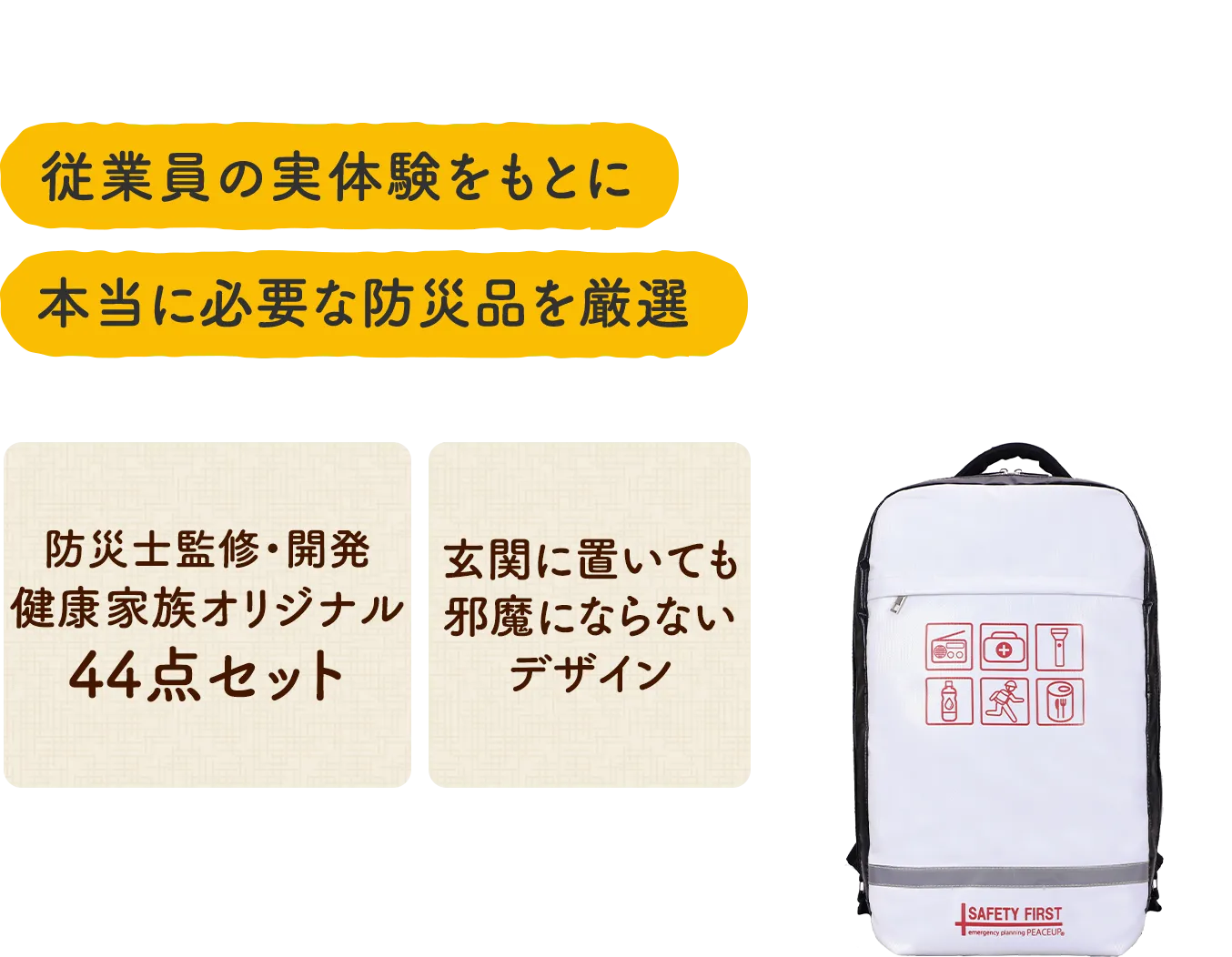 アルファ化米6種(7年保存)サタケななこめっつ: 五目ご飯/わかめご飯/梅昆布ご飯/青菜ご飯/白飯/ 鯛めし(各70g) 、ぱん革命3袋(7年保存):北海道濃厚ミルク/チョコレート/ブルーベリー(各1袋) 、保存水3本(10年保存) :500ml×3本、静音エマージェンシーアルミ寝袋 、衣類圧縮袋 、冷熱快適アルミシート 、非常用給水バッグ(5L) 、静音エマージェンシーアルミシート 、安眠セット(ネックピロー+アイマスク+耳栓) 、メモ帳 、ボールペン 、携帯用レインポンチョ 、アルミホイッスル 、滑り止め付背抜き手袋、非常用簡易トイレ(10回分) 、お口スッキリシート(2枚入) 、圧縮フェイスタオル 、EVAソールスリッパ 、歯ブラシセット(歯磨き粉3g付き)×2セット 、個包装マスク×3枚 、10年保存できる防災用ウェットティッシュ(20枚入) 、水に流せるティッシュペーパー(10枚入)×3袋 、救急セットエイドチーム(ケース内容:ハサミ・つめきり・ピンセット・ワンタッチ 包帯・綿棒×10本)、多機能防災ラジオ 、USBケーブルタイプC 、ライトニング端子 、マイクロUSB端子 、ミニLEDランタン 、乾電池式モバイルバッテリー(ブラックorホワイト) 、10年保存防災電池(単3×4本、単4×4本)