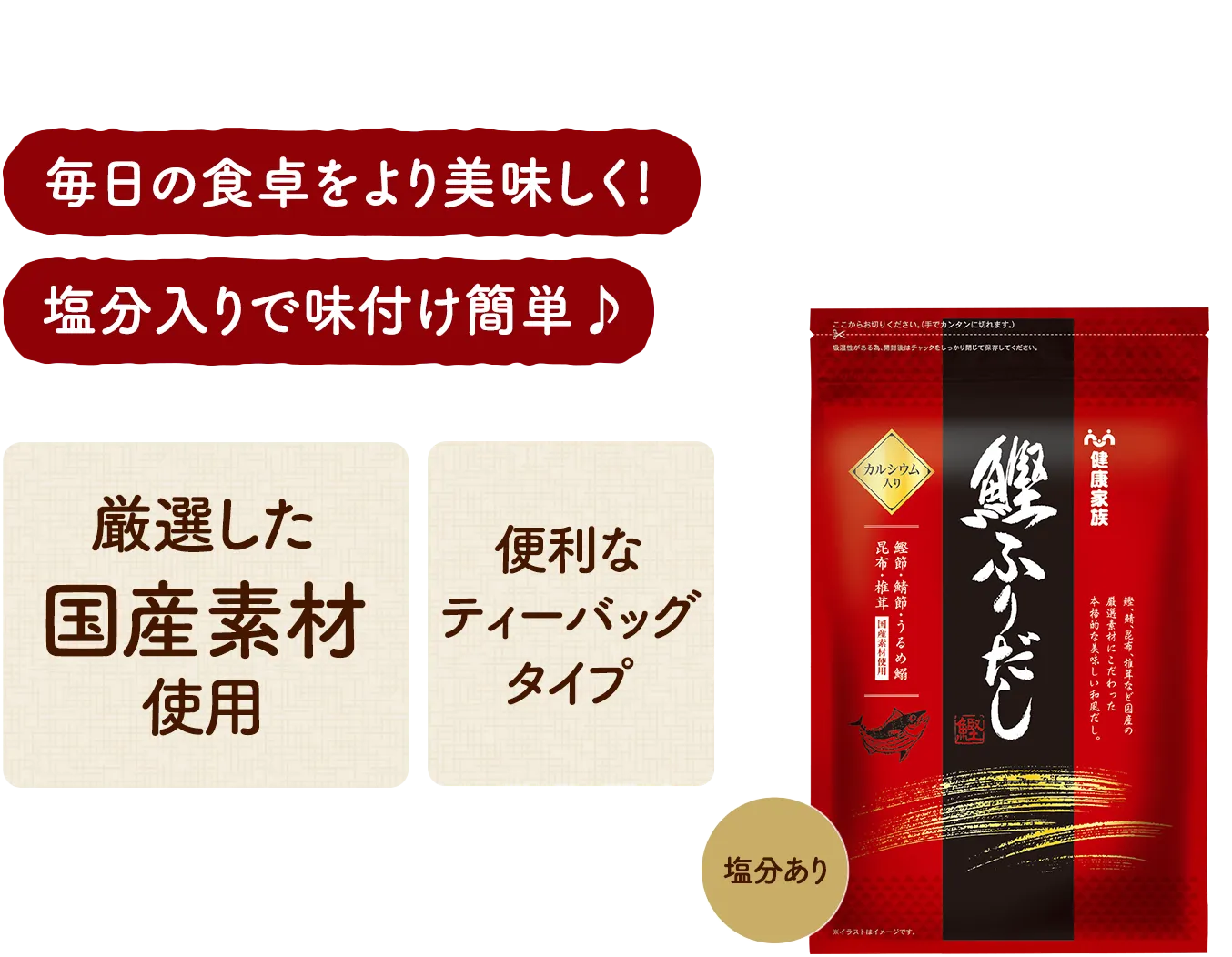 食塩(国内製造)、砂糖、風味原料(鰹節粉末、煮干うるめ鰯粉末、鯖節粉末、椎茸粉末、昆布粒)、鰹だし顆粒、粉末醤油、食用植物油脂/調味料(アミノ酸等)、乳酸カルシウム、(一部に小麦・さば・大豆を含む)