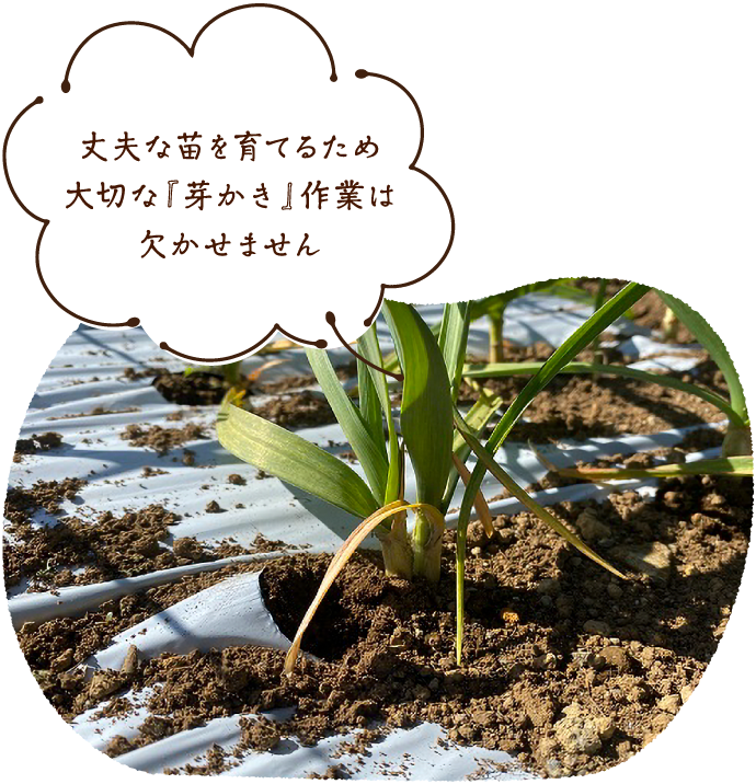 芽かきを行うことで、にんにく同士の根の密集を防ぎ丈夫な苗を確実に育てることができます!