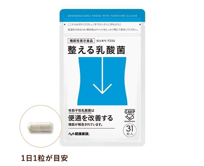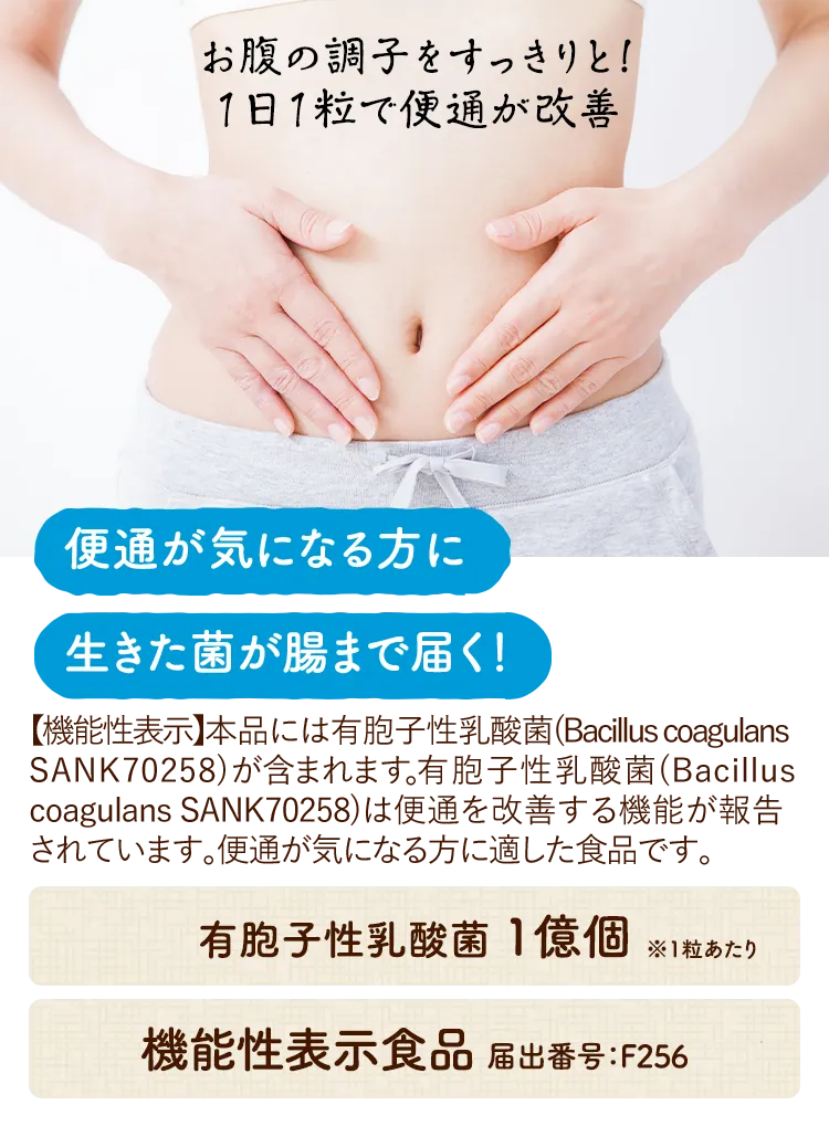 本品には有胞子性乳酸菌(Bacillus coagulans SANK70258)が含まれます。有胞子性乳酸菌(Bacillus coagulans SANK70258)は便通を改善する機能が報告されています。便通が気になる方に適した食品です。